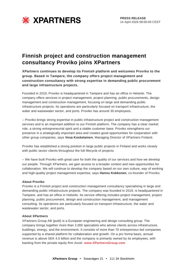 XPartners continues to develop its Finnish platform and welcomes Proviko to the group. Based in Tampere, the company offers project management and construction consultancy with strong expertise in demanding public procurement and large infrastructure projects.