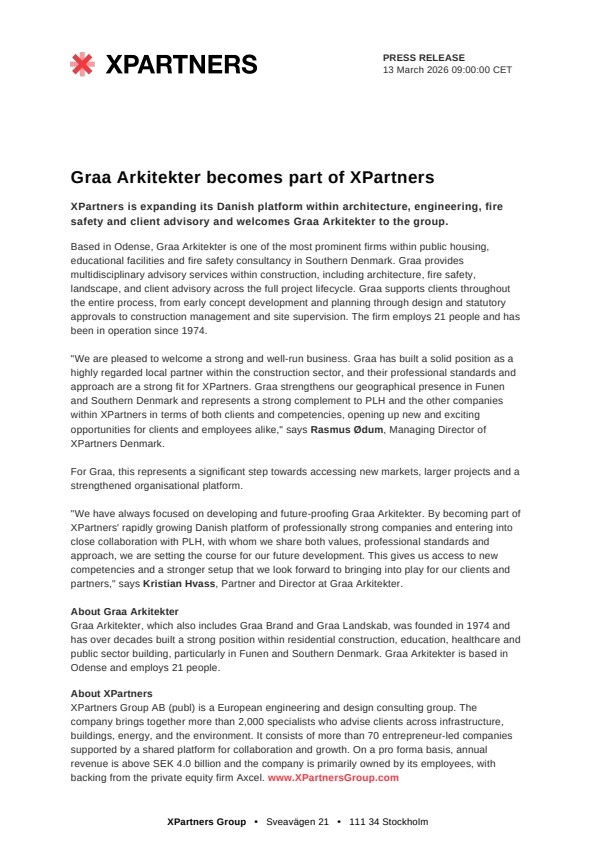 “We are pleased to welcome a strong and well-run business. Graa has built a solid position as a highly regarded local partner within the construction sector, and their professional standards and approach are a strong fit for XPartners. Graa strengthens our geographical presence in Funen and Southern Denmark and represents a strong complement to PLH and the other companies within XPartners in terms of both clients and competencies, opening up new and exciting opportunities for clients and employees alike,” says Rasmus Ødum, Managing Director of XPartners Denmark.