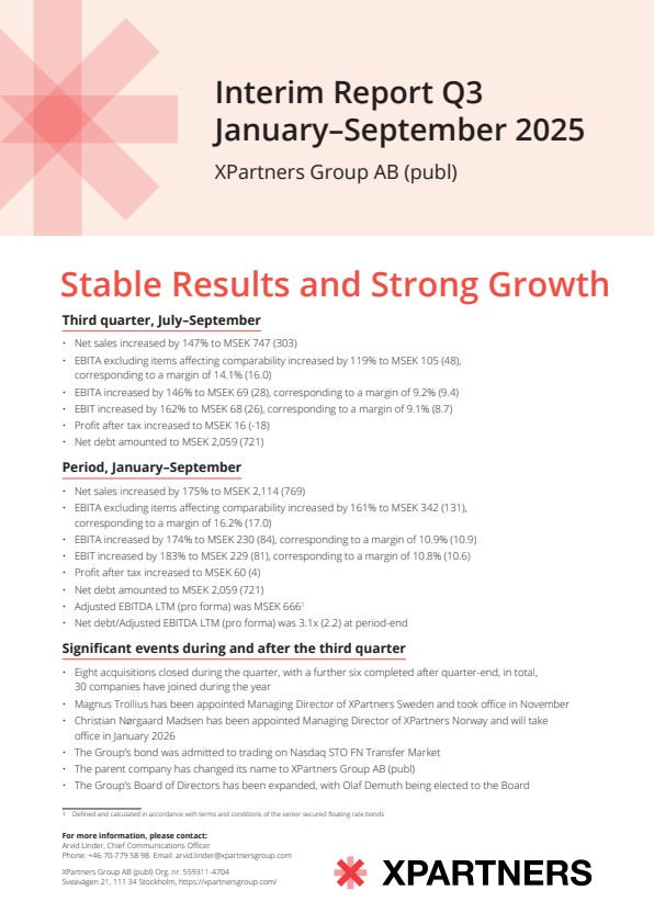 We remain positive on the acquisitions market and work methodically to build and pursue a pipeline of successful, well-managed companies. Interest in becoming part of XPartners remains strong, with many high-quality entrepreneur-led businesses approaching us. During the quarter, eight acquisitions closed, strengthening our capabilities, broadening the customer base and increasing network effects. In parallel, we are preparing for growth in Germany and the Netherlands by strengthening local leadership, establishing governance and readying processes for further expansion.