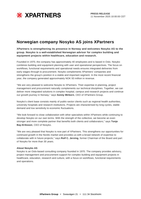 “We are very pleased that Nosyko is now part of XPartners. This strengthens our opportunities for continued growth in the Nordic market and provides us with a broad network of expertise to collaborate with in future projects,” says Rolf C. Jerving, former Chairman of the Board and part of Nosyko for more than 30 years.
