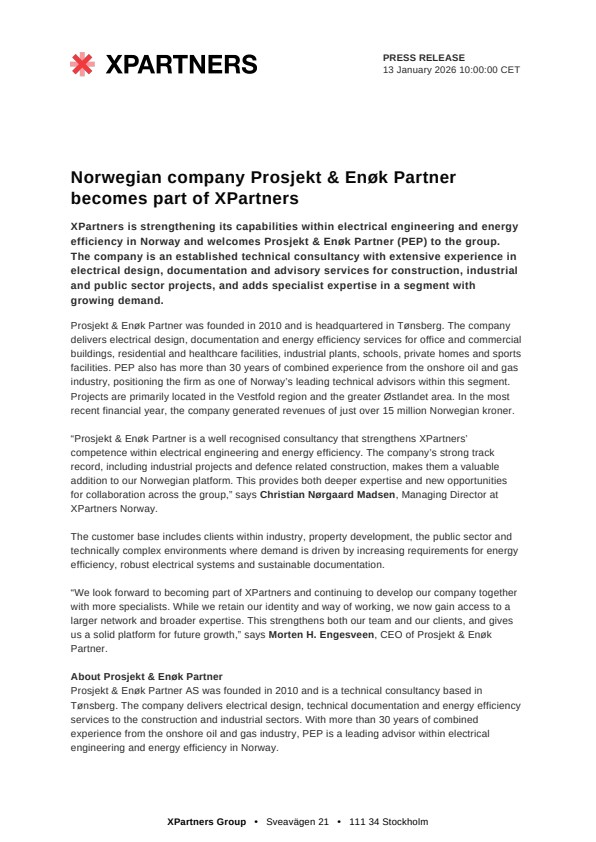 “Prosjekt & Enøk Partner is a well recognised consultancy that strengthens XPartners’ competence within electrical engineering and energy efficiency. The company’s strong track record, including industrial projects and defence related construction, makes them a valuable addition to our Norwegian platform. This provides both deeper expertise and new opportunities for collaboration across the group,” says Christian Nørgaard Madsen, Managing Director at XPartners Norway.