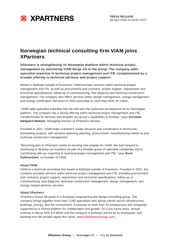 “VIAM adds specialist expertise that fits well with the continued development of our Norwegian platform. The company has a strong offering within technical project management and ITB, complemented by services that broaden the group’s capabilities in Norway,” says Christian Nørgaard Madsen, Managing Director of XPartners Norway.