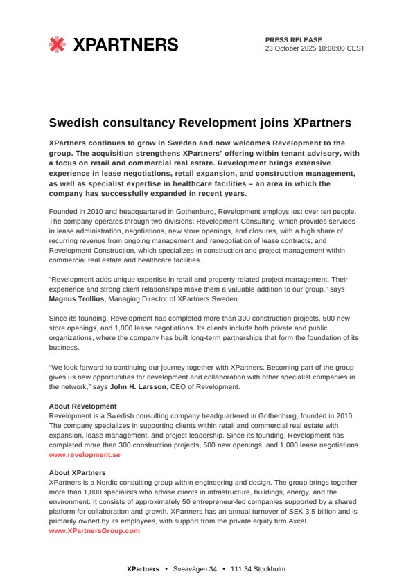 “Revelopment adds unique expertise in retail and property-related project management. Their experience and strong client relationships make them a valuable addition to our group,” says Magnus Trollius, Managing Director of XPartners Sweden.