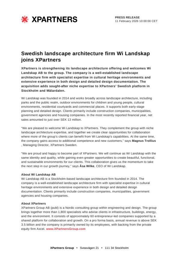 “We are pleased to welcome Wi Landskap to XPartners. They complement the group with niche landscape architecture expertise, and together we create clear opportunities for collaboration where more of the group’s clients can benefit from Wi Landskap’s capabilities. At the same time, the company gains access to additional competence and new customers,” says Magnus Trollius, Managing Director, XPartners Sweden.