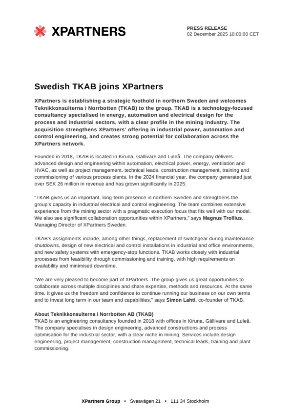 “TKAB gives us an important, long-term presence in northern Sweden and strengthens the group’s capacity in industrial electrical and control engineering. The team combines extensive experience from the mining sector with a pragmatic execution focus that fits well with our model. We also see significant collaboration opportunities within XPartners,” says Magnus Trollius, Managing Director of XPartners Sweden.