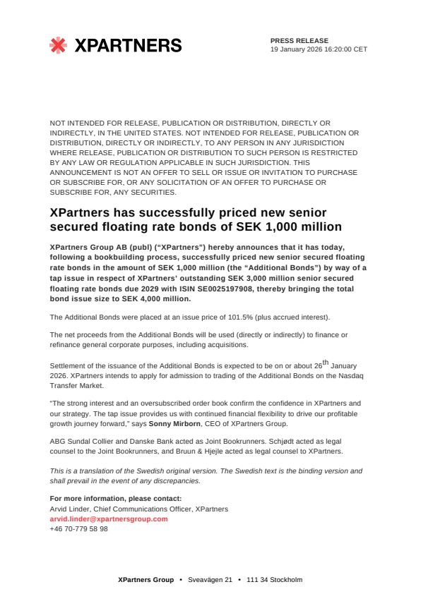 XPartners Group AB (publ) (“XPartners”) hereby announces that it has today, following a bookbuilding process, successfully priced new senior secured floating rate bonds in the amount of SEK 1,000 million (the “Additional Bonds”) by way of a tap issue in respect of XPartners’ outstanding SEK 3,000 million senior secured floating rate bonds due 2029 with ISIN SE0025197908, thereby bringing the total bond issue size to SEK 4,000 million.