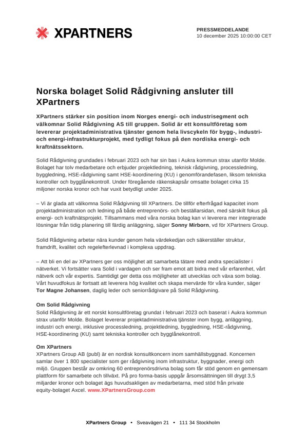 – Vi är glada att välkomna Solid Rådgivning till XPartners. De tillför efterfrågad kapacitet inom projektadministration och ledning på både entreprenörs- och beställarsidan, med särskilt fokus på energi- och kraftnätsprojekt. Tillsammans med våra norska bolag kan vi leverera mer integrerade lösningar från tidig planering till färdig anläggning, säger Sonny Mirborn, vd för XPartners Group.