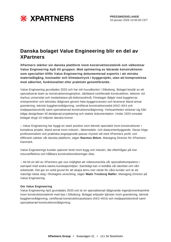 – Value Engineering har byggt en stark position som teknisk specialist inom konstruktioner i komplexa projekt, bland annat inom industri-, läkemedels- och datacenterbyggande. Deras höga professionalism och praktiska angreppssätt passar mycket väl med XPartners profil, och tillförseln stärker vår danska plattform, säger Rasmus Ødum, Managing Director för XPartners Danmark.