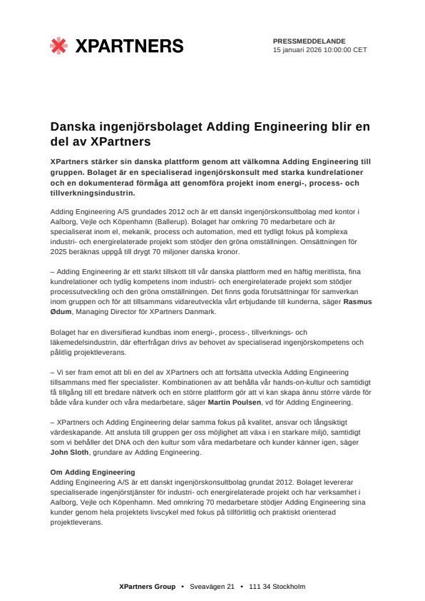 – Vi ser fram emot att bli en del av XPartners och att fortsätta utveckla Adding Engineering tillsammans med fler specialister. Kombinationen av att behålla vår hands-on-kultur och samtidigt få tillgång till ett bredare nätverk och en större plattform gör att vi kan skapa ännu större värde för både våra kunder och våra medarbetare, säger Martin Poulsen, vd för Adding Engineering.