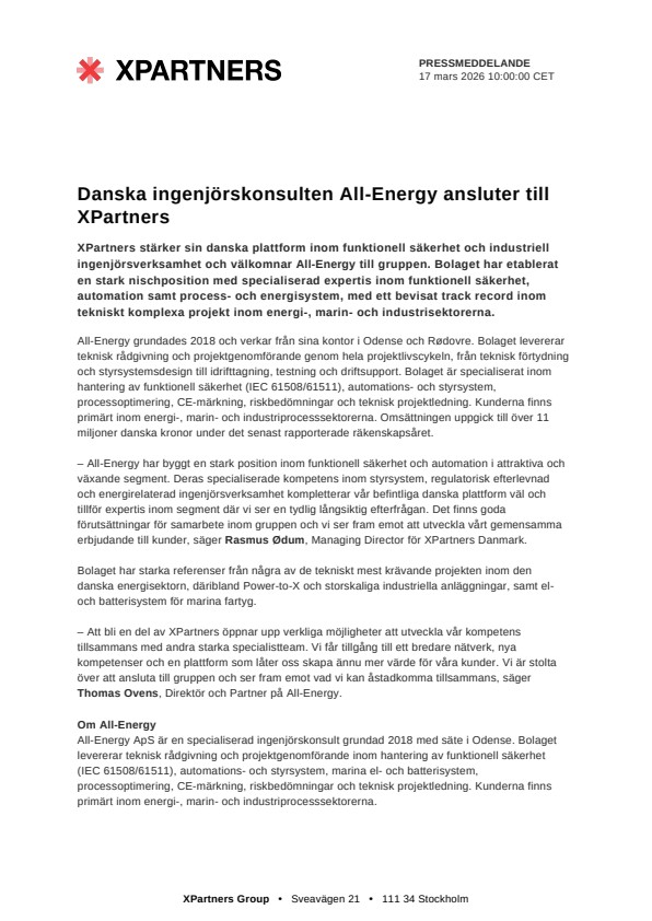 – All-Energy har byggt en stark position inom funktionell säkerhet och automation i attraktiva och växande segment. Deras specialiserade kompetens inom styrsystem, regulatorisk efterlevnad och energirelaterad ingenjörsverksamhet kompletterar vår befintliga danska plattform väl och tillför expertis inom segment där vi ser en tydlig långsiktig efterfrågan. Det finns goda förutsättningar för samarbete inom gruppen och vi ser fram emot att utveckla vårt gemensamma erbjudande till kunder, säger Rasmus Ødum, Managing Director för XPartners Danmark.