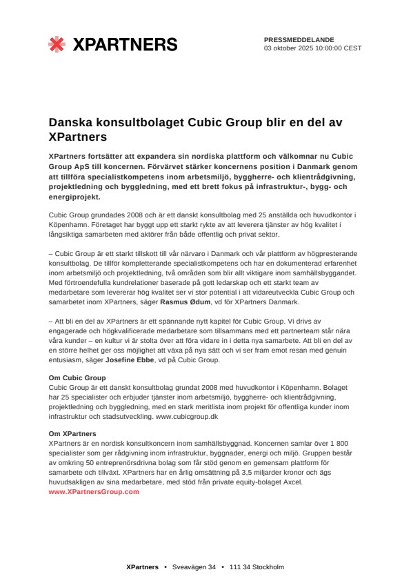 – Cubic Group är ett starkt tillskott till vår närvaro i Danmark och vår plattform av högpresterande konsultbolag. De tillför kompletterande specialistkompetens och har en dokumenterad erfarenhet inom arbetsmiljö och projektledning, två områden som blir allt viktigare inom samhällsbyggandet. Med förtroendefulla kundrelationer baserade på gott ledarskap och ett starkt team av medarbetare som levererar hög kvalitet ser vi stor potential i att vidareutveckla Cubic Group och samarbetet inom XPartners, säger Rasmus Ødum, vd för XPartners Danmark.