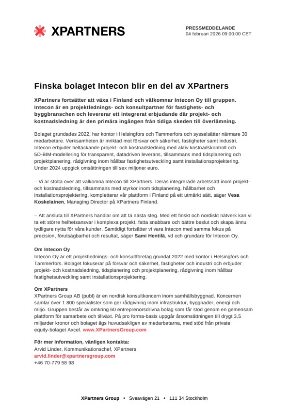 – Vi är stolta över att välkomna Intecon till XPartners. Deras integrerade arbetssätt inom projekt- och kostnadsledning, tillsammans med styrkor inom tidsplanering, hållbarhet och installationsprojektering, kompletterar vår plattform i Finland på ett utmärkt sätt, säger Vesa Koskelainen, Managing Director på XPartners Finland.