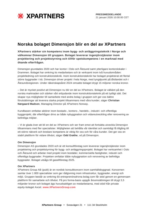– Det är mycket positivt att Dimensjon nu blir en del av XPartners. Bolaget är välkänt på den norska marknaden och stärker vårt erbjudande inom konstruktionsteknik på ett tydligt sätt. Det skapar nya möjligheter till samarbete med andra bolag i gruppen och ger oss bättre förutsättningar att leverera starka projekt tillsammans med våra kunder, säger Christian Nørgaard Madsen, Managing Director på XPartners Norway.