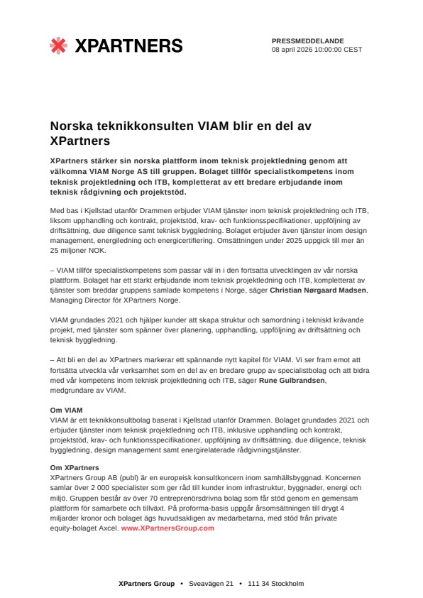– VIAM tillför specialistkompetens som passar väl in i den fortsatta utvecklingen av vår norska plattform. Bolaget har ett starkt erbjudande inom teknisk projektledning och ITB, kompletterat av tjänster som breddar gruppens samlade kompetens i Norge, säger Christian Nørgaard Madsen, Managing Director för XPartners Norge.