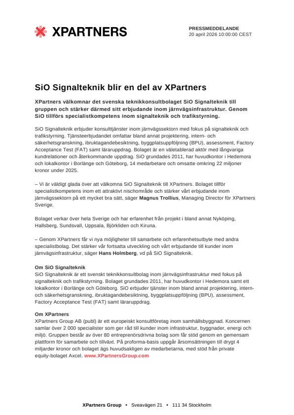 – Vi är väldigt glada över att välkomna SiO Signalteknik till XPartners. Bolaget tillför specialistkompetens inom ett attraktivt nischområde och stärker vårt erbjudande inom järnvägssektorn på ett mycket bra sätt, säger Magnus Trollius, Managing Director för XPartners Sverige.